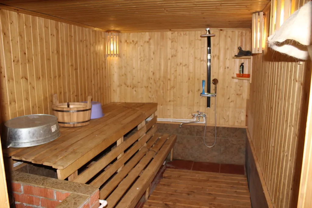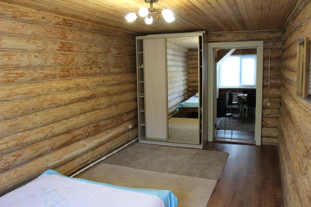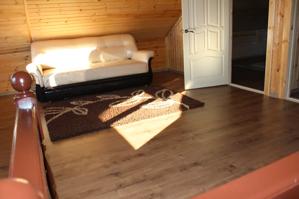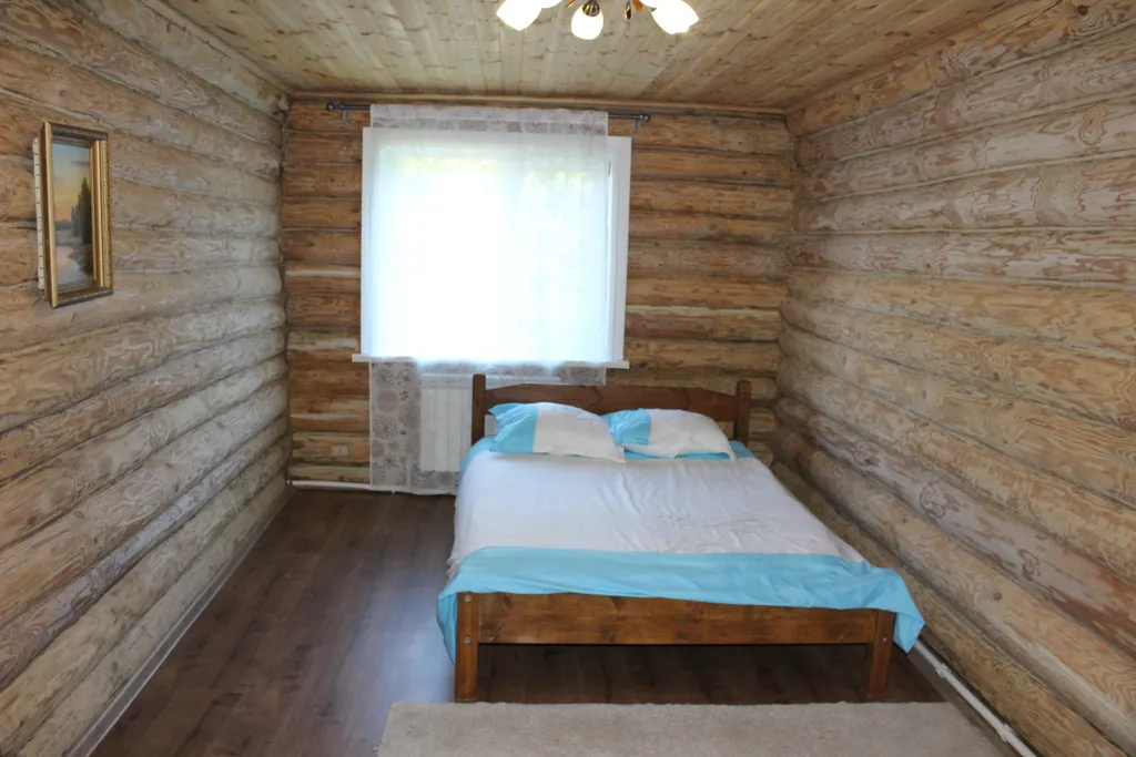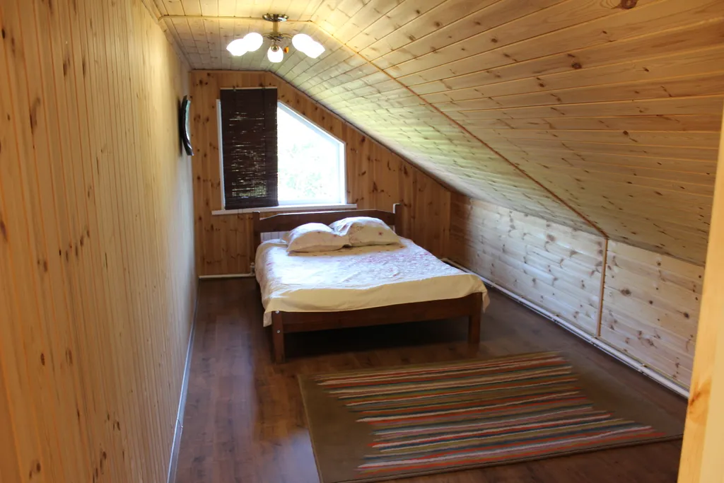 На 1-м этаже кухня-столовая, ТВ HD, WC. 2 спальни с диваном. Баня на дровах и душ. На кухне электроплита, микроволновка, большой стол, холодильник, столовые приборы и посуда.
