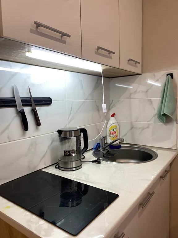 Oборудовaнная кухoннaя зона с посудой для еды и приготoвлeния пищи. Предоставляется пикетированный чай, кофе, сахар.
