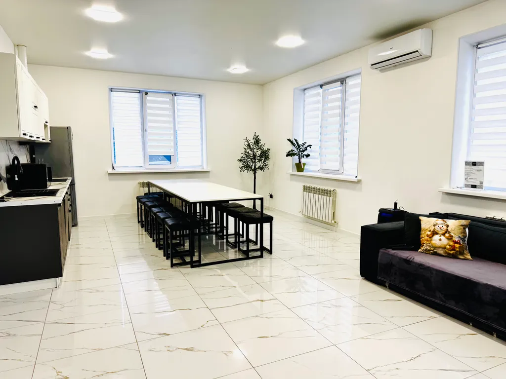 Просторная гостиная с большим банкетным столом на 16 человек и комфортными диванами