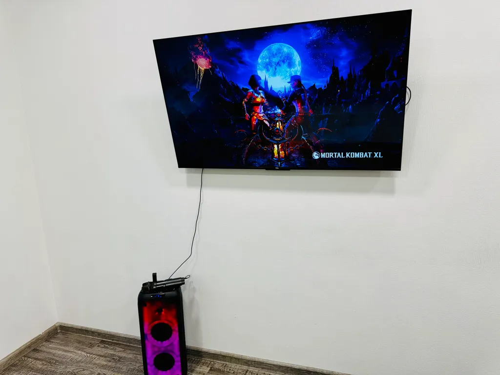 Игровая зона: диван, караоке, Sony PlayStation 4, телевизор 4К, беспроводная колонка, 2 микрофона.