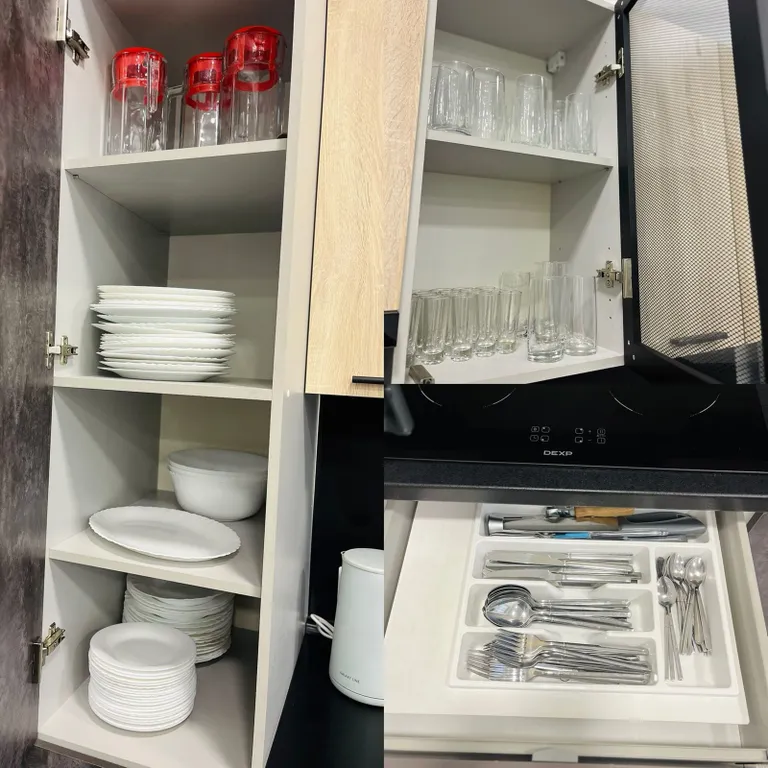 Полностью оборудованная кухонная зона: плита, холодильник, микроволновка, чайник, полный комплект посуды на 20 персон;