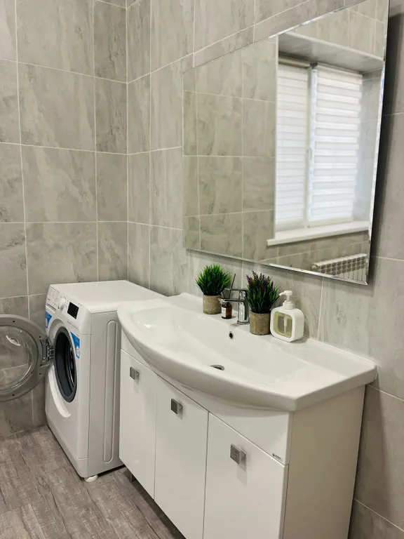 Большая ванная комната (ванна, раковина, унитаз, стиральная машина), есть утюг, гладильная доска.