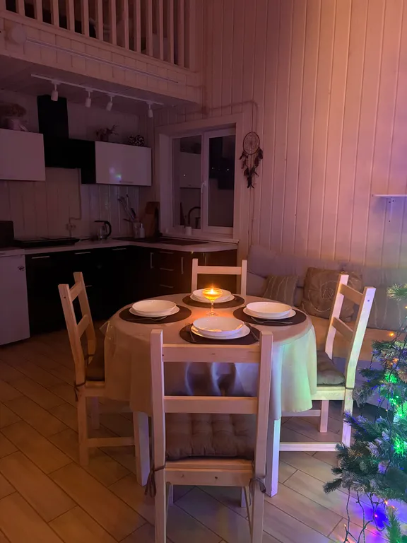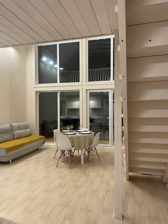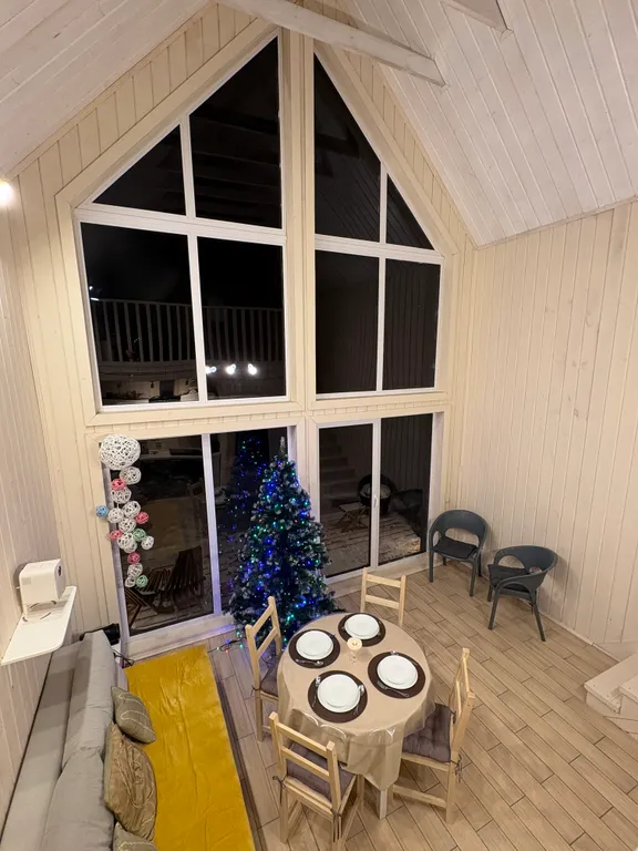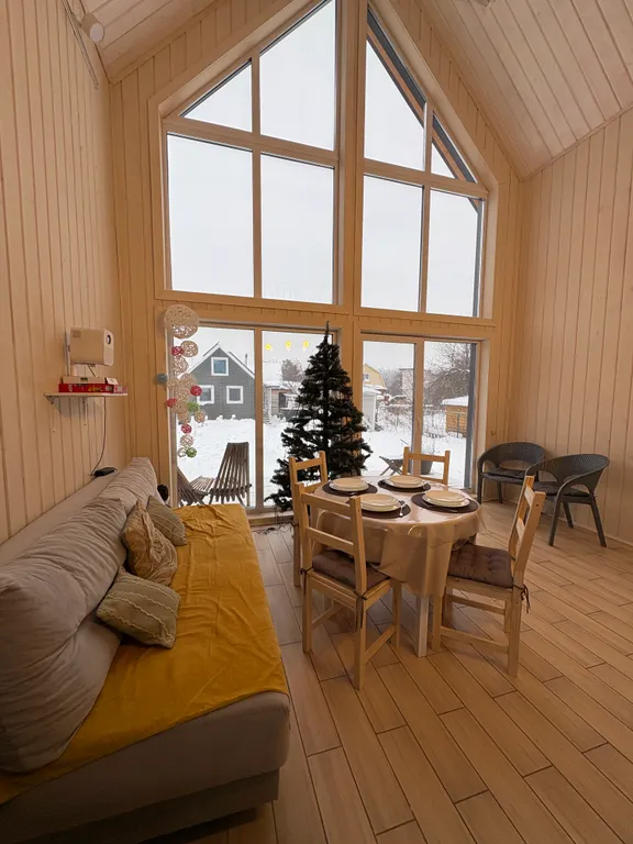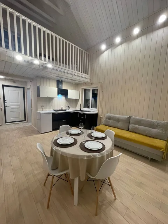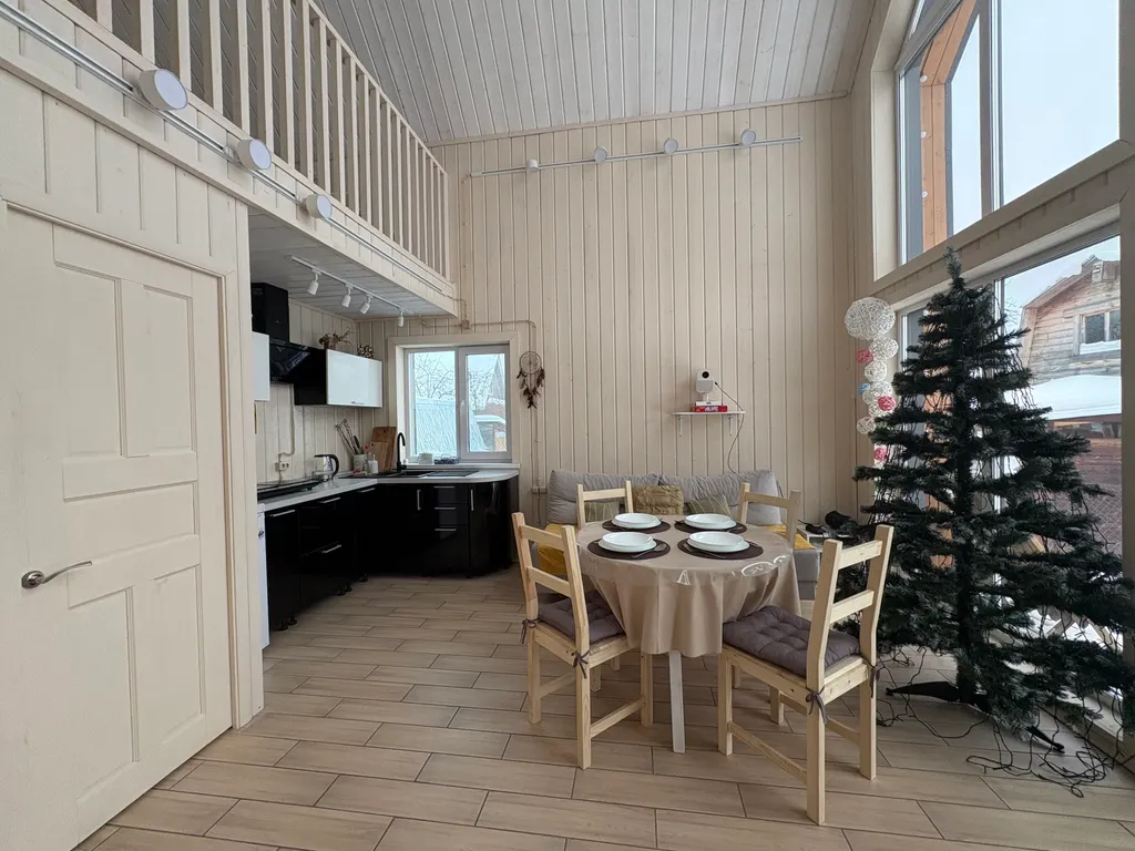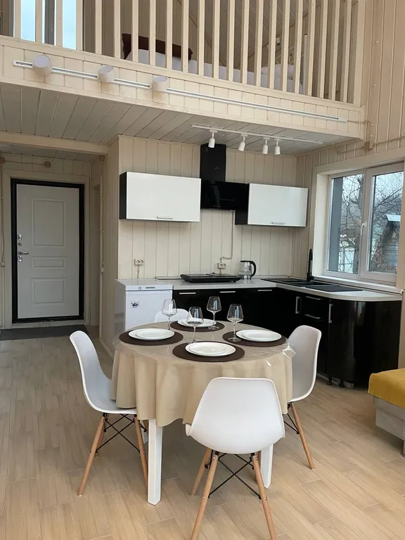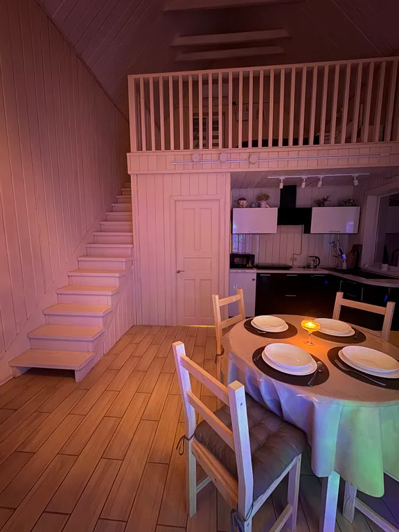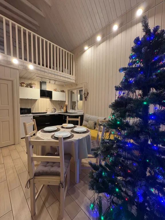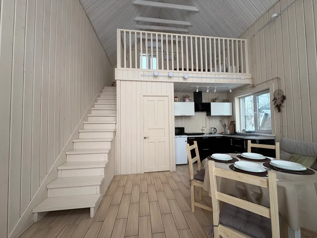 Дом рассчитан на комфортное проживание 2 человек с возможностью разместить еще двух гостей на первом этаже и при необходимости еще двух людей в бане.