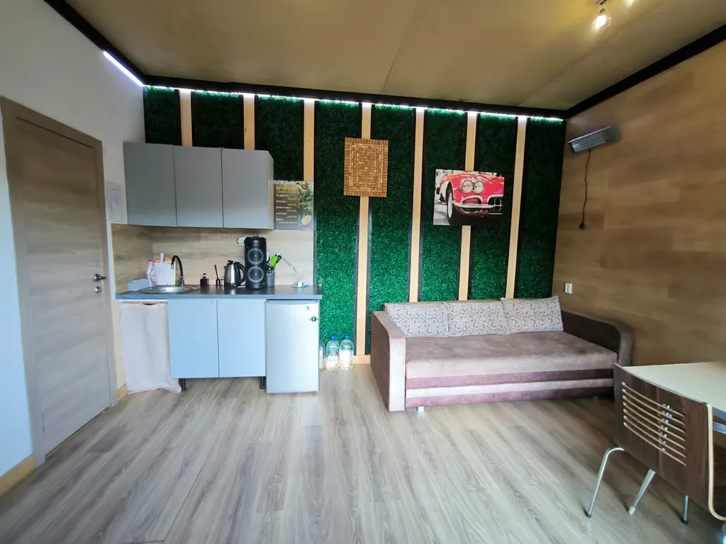 Кухонная зона: электрочайник, мини- холодильник, микроволновая печь, мойка, электрическая плита, кастрюля, сковородка, посуда на 6 чел.