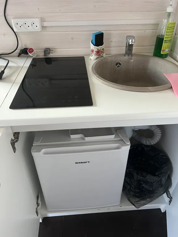 Посуда: кастрюля, сковорода, фужеры, рюмки, стаканы, тарелки, салатницы, приборы, ножи, штопор, открывашка, жидкое мыло, жидкость для посуды, тряпка и губка, туалетная бумага.