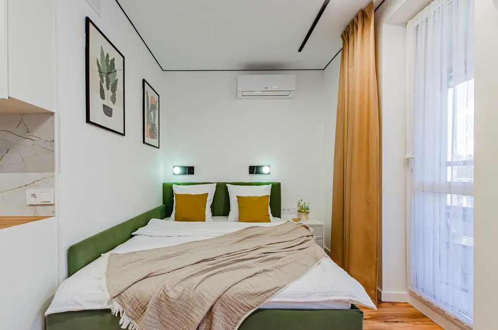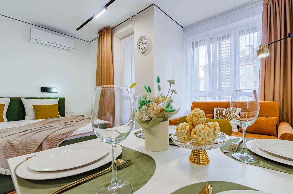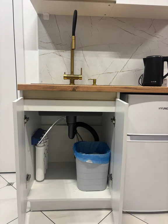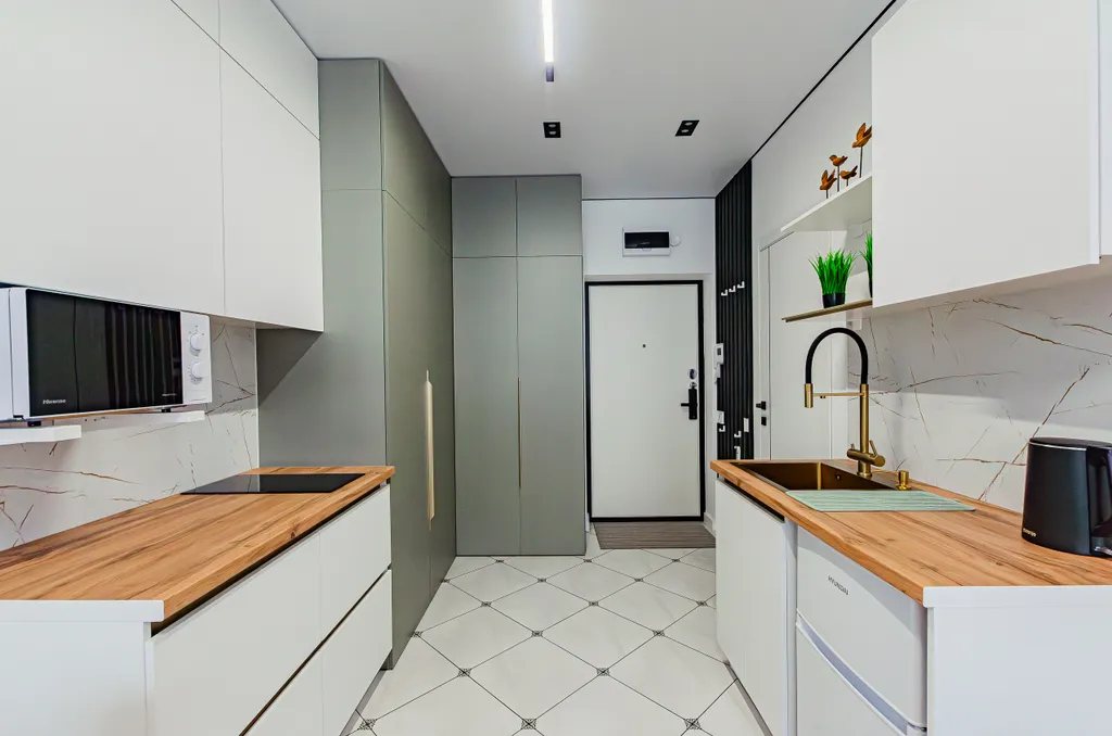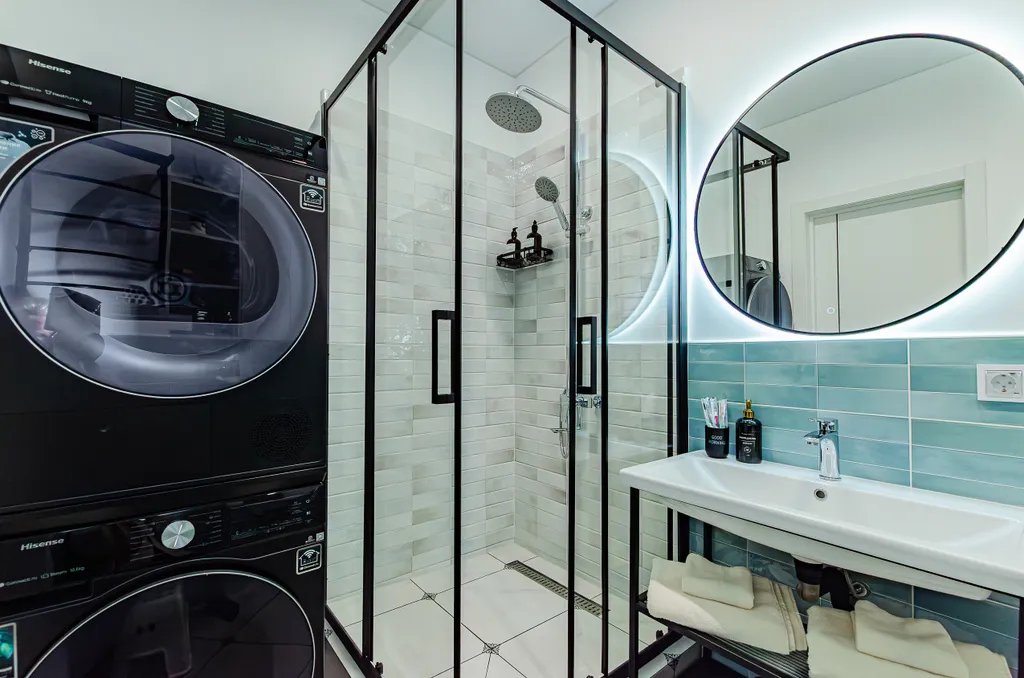 - Вся бытовая техника: Wi-Fi, телевизор со Smart TV, кондиционер, водонагреватель, стиральная машина, сушилка, утюг, чайник, варочная плита и вся необходимая посуда для приготовления пищи.