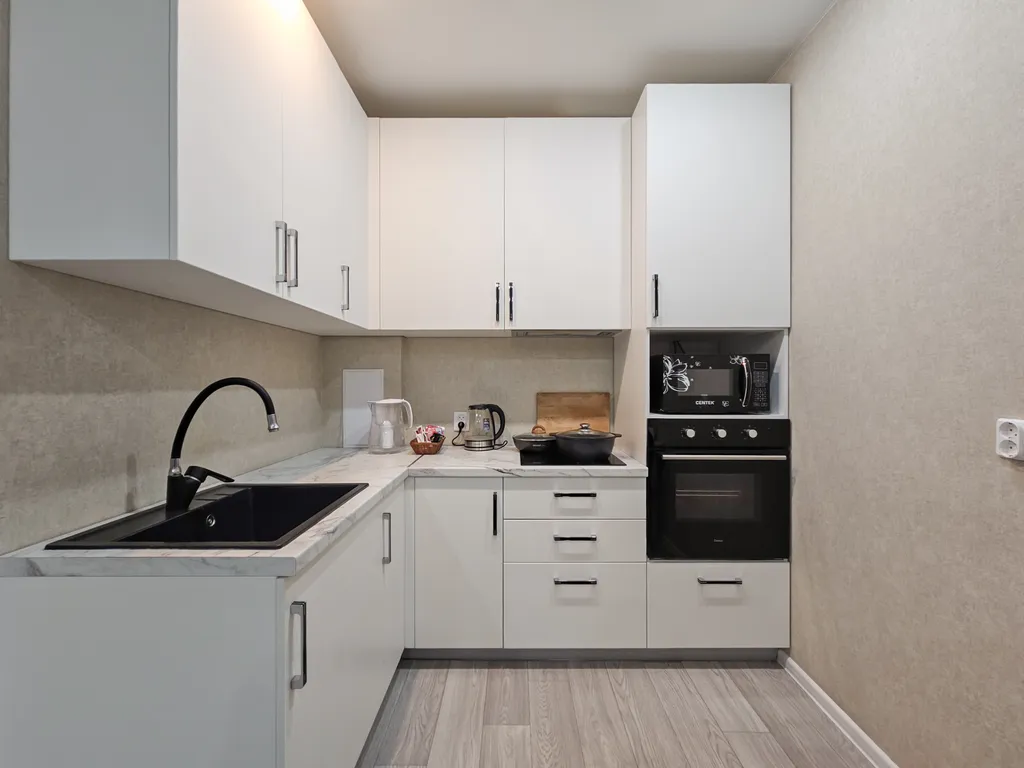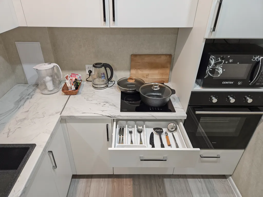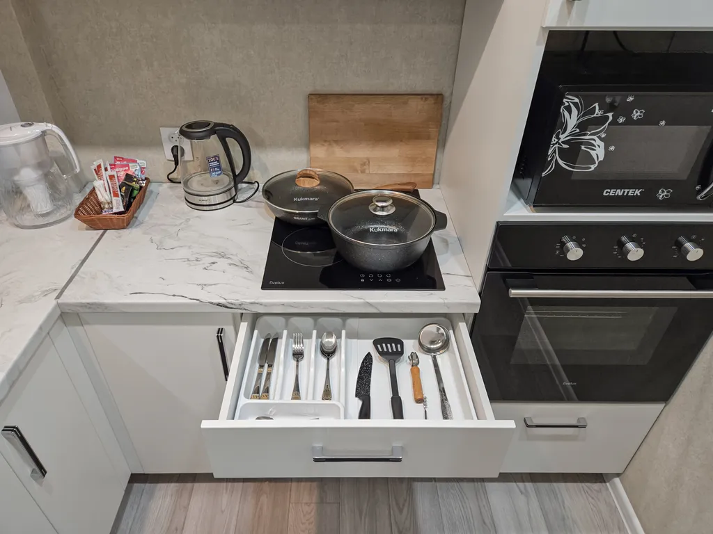Кухня: Холодильник, варочная панель, духовой шкаф, микроволновка, чайник и полный набор посуды для готовки.