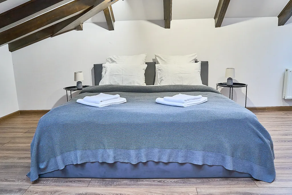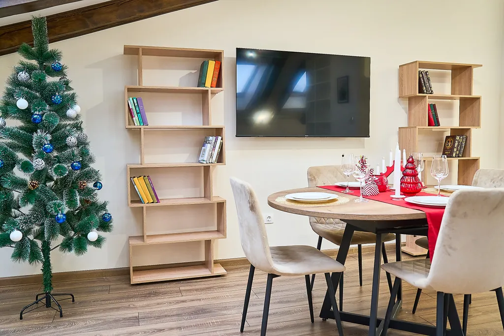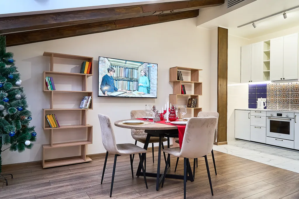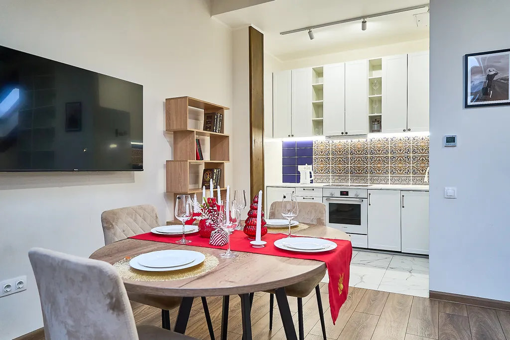 В апартаментах есть все необходимое для комфортного проживания гостей, большая (шириной 2 метра) двухспальная кровать, большой телевизор 65 дюймов, кухня снабжена всей необходимой техникой и посудой премиум класса: