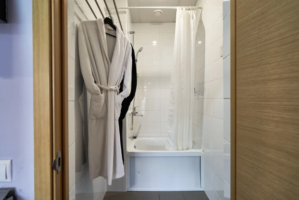 В номере одна двуспальная кровать, оснащен всем необходимым для комфортного проживания: телевизор с плоским экраном, телефон, оборудованная кухонная зона со всем необходимым, микроволновка, холодильник, кондиционер/ система климат-контроля, чайная станция, ванная, фен, халат, тапочки, туалетно-косметические принадлежности, рабочая зона, стол, стул.