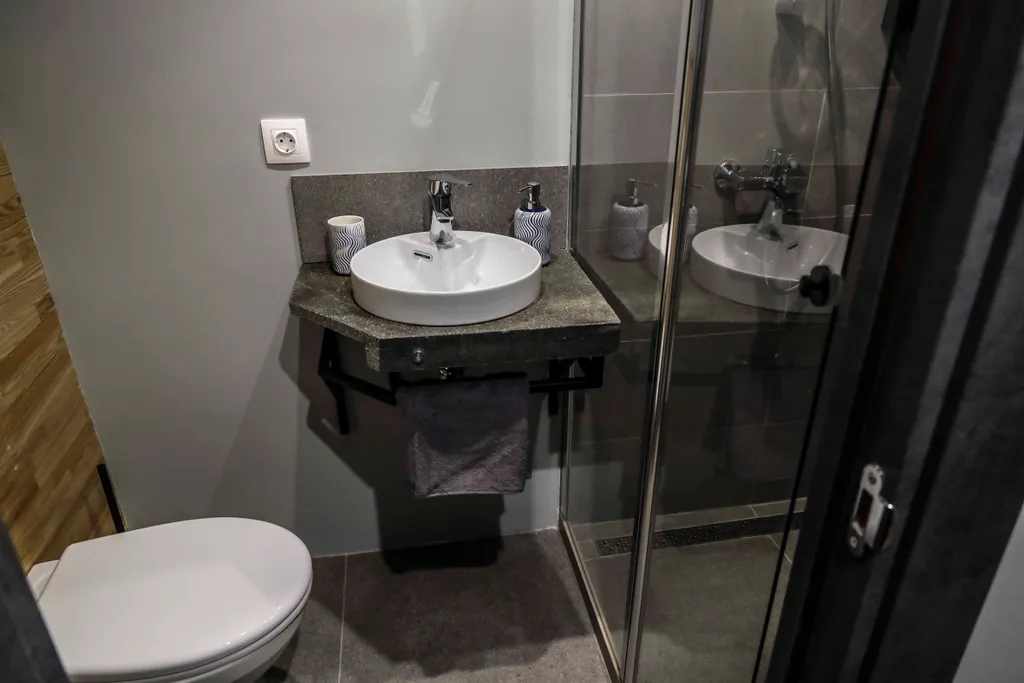 Оборудована душевой кабиной со стеклянным ограждением, дозатором с гелем для душа и жидким мылом для рук, феном.