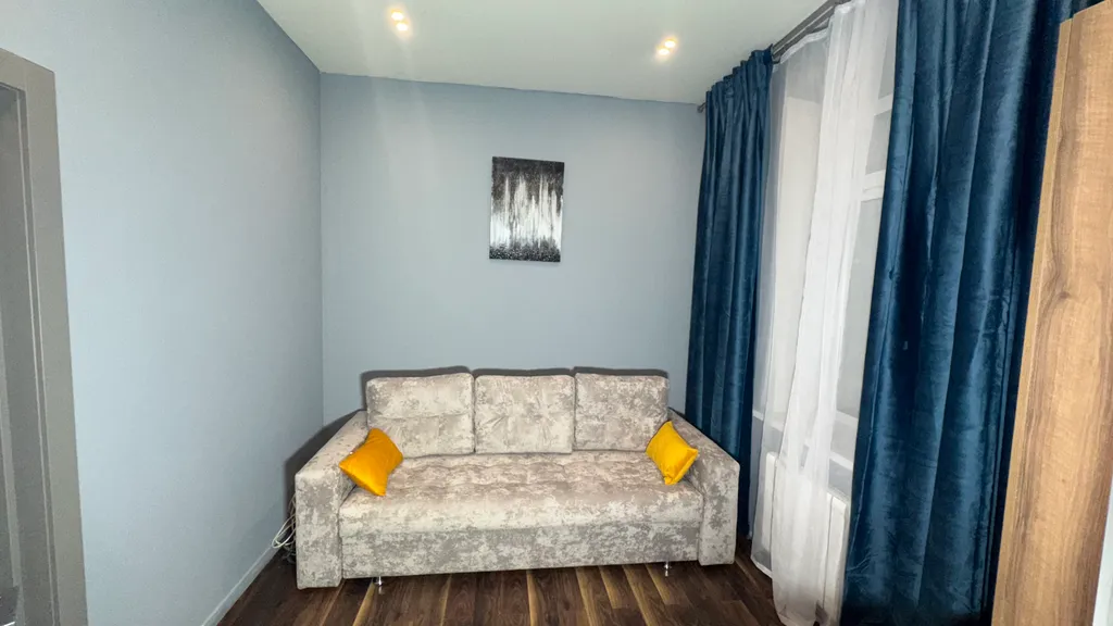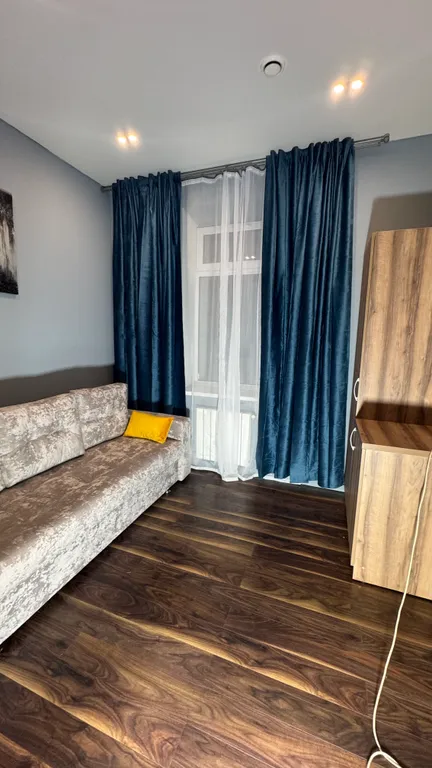 В оформлении доминирует современная дымчато-серая палитра, создающая стильную, спокойную и нейтральную среду. Ярким контрастным акцентом выступают глубокие синие шторы, добавляющие интерьеру динамики и глубины. Стиль — городской лофт с элементами минимализма.