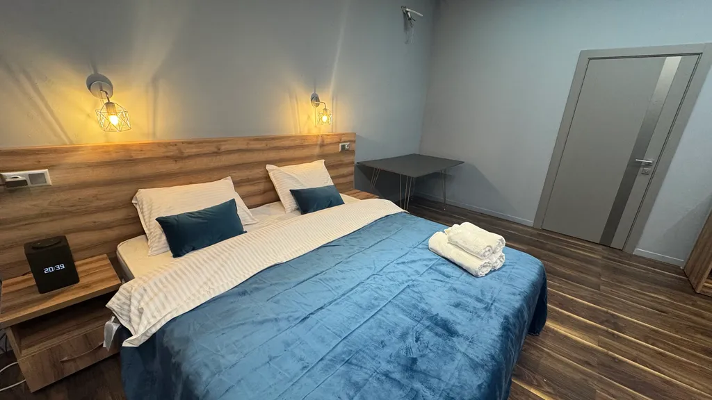 · Просторная двуспальная кровать с ортопедическим матрасом.