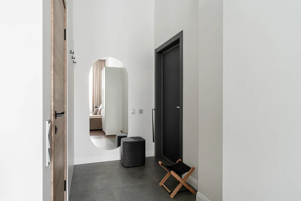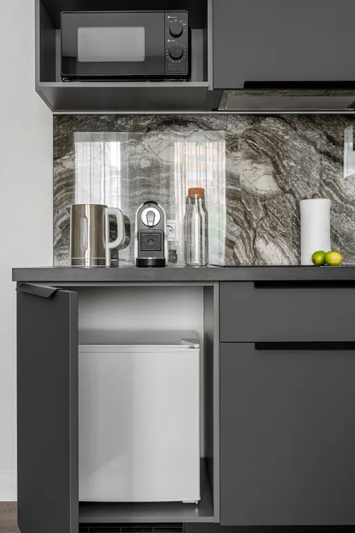 2. Кухня со всем необходимым наполнением: двухкомфорочная индукционная плита, чайник, мини холодильник, набор столовой и кухонной посуды, микроволновая печь, капсульная кофемашина.