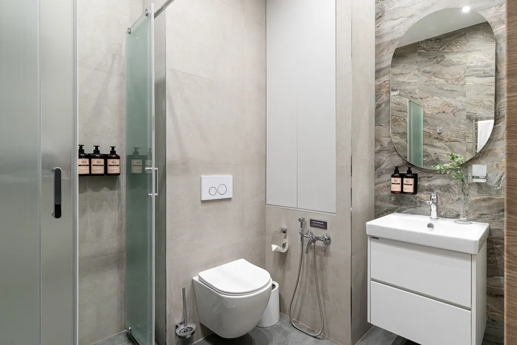 7. Сан узел с гигиеническим душем, душевой кабиной и косметикой индивидуального производства. Гигиенические принадлежности, набор одноразовых тапочек, халаты (по запросу).