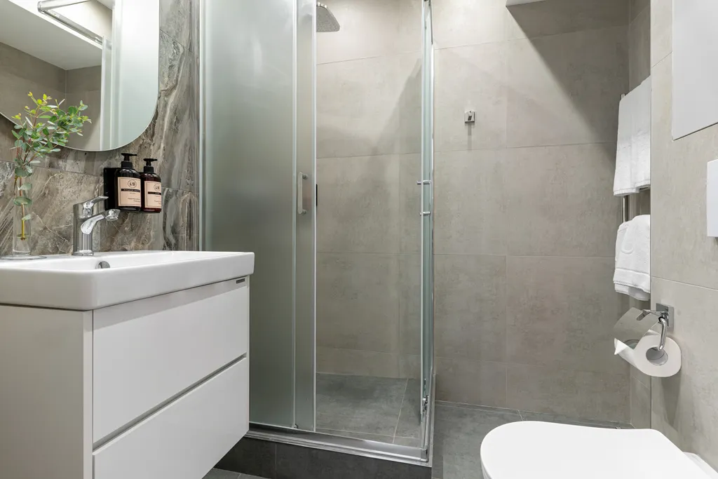 8. Сан узел с гигиеническим душем, душевой кабиной и косметикой индивидуального производства. Гигиенические принадлежности, набор одноразовых тапочек, халаты.