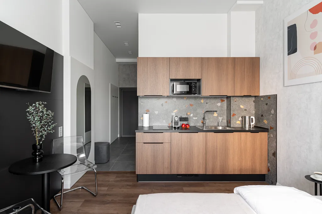 2. Кухня со всем необходимым наполнением: двухкомфорочная индукционная плита, чайник, мини холодильник, набор столовой и кухонной посуды , микроволновая печь.
