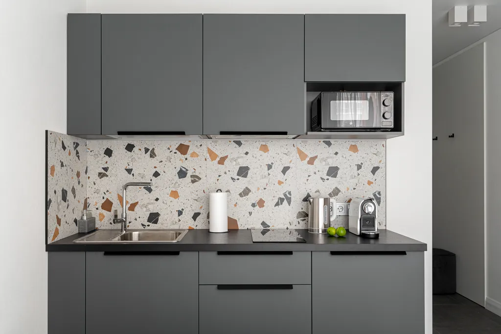2. Кухня со всем необходимым наполнением: двухкомфорочная индукционная плита, чайник, мини холодильник, набор столовой и кухонной посуды, микроволновая печь.