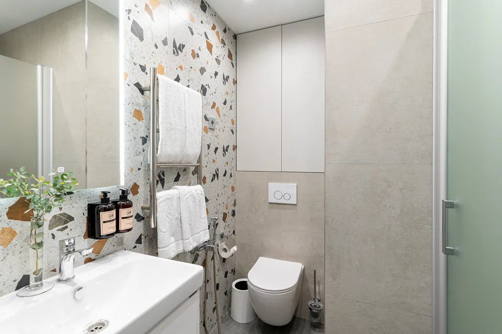 7. Сан узел с гигиеническим душем, душевой кабиной и косметикой индивидуального производства. Гигиенические принадлежности, набор одноразовых тапочек.