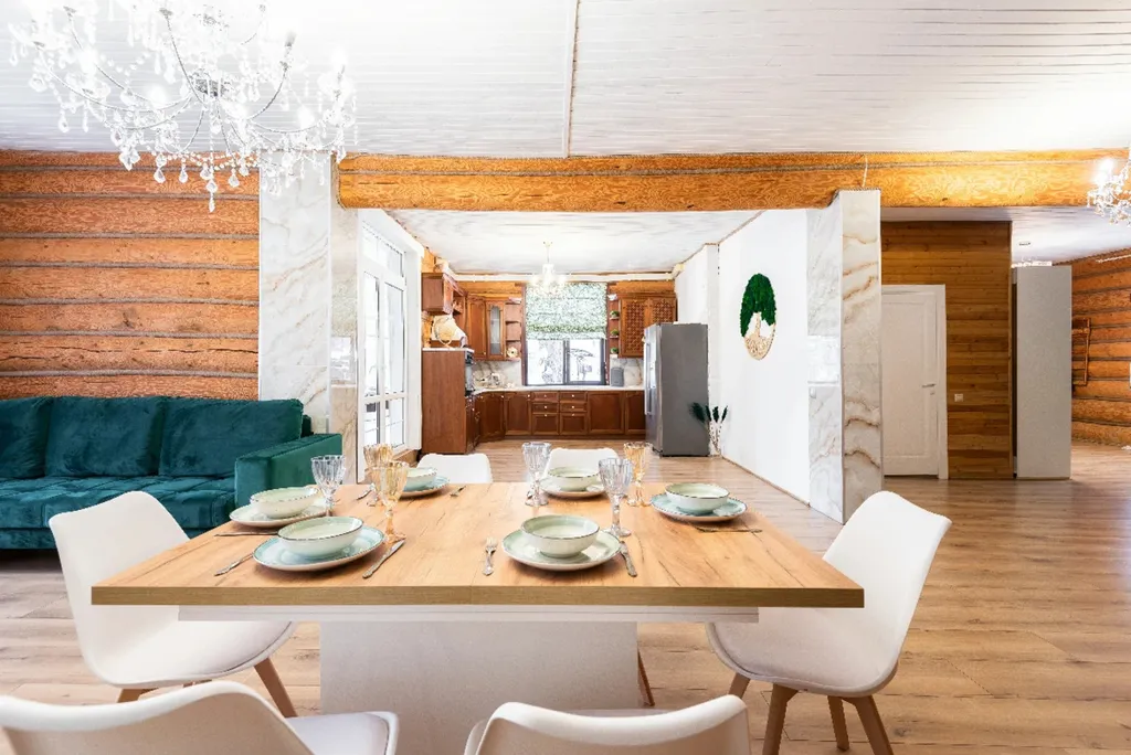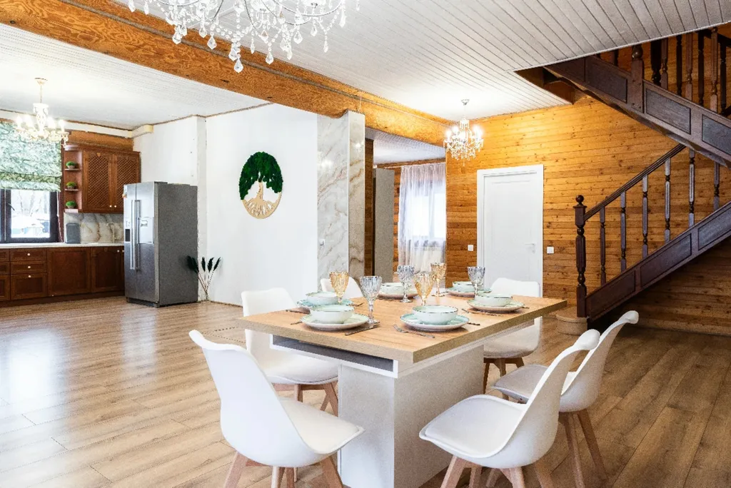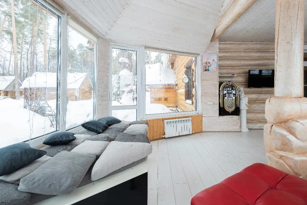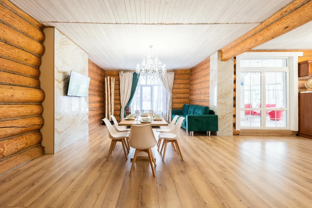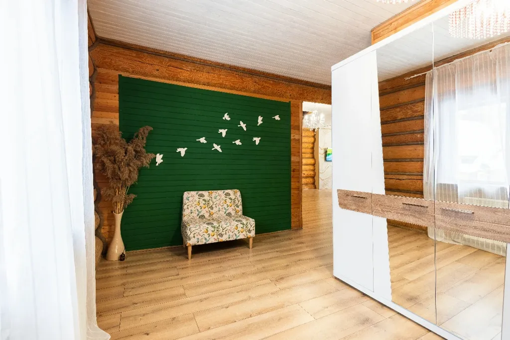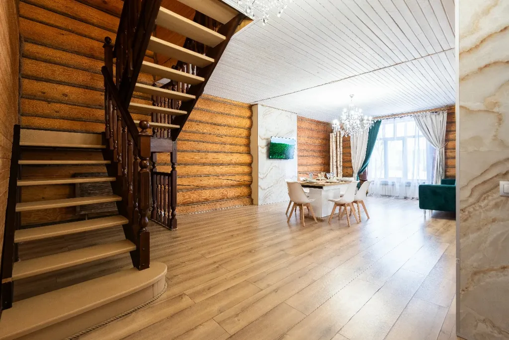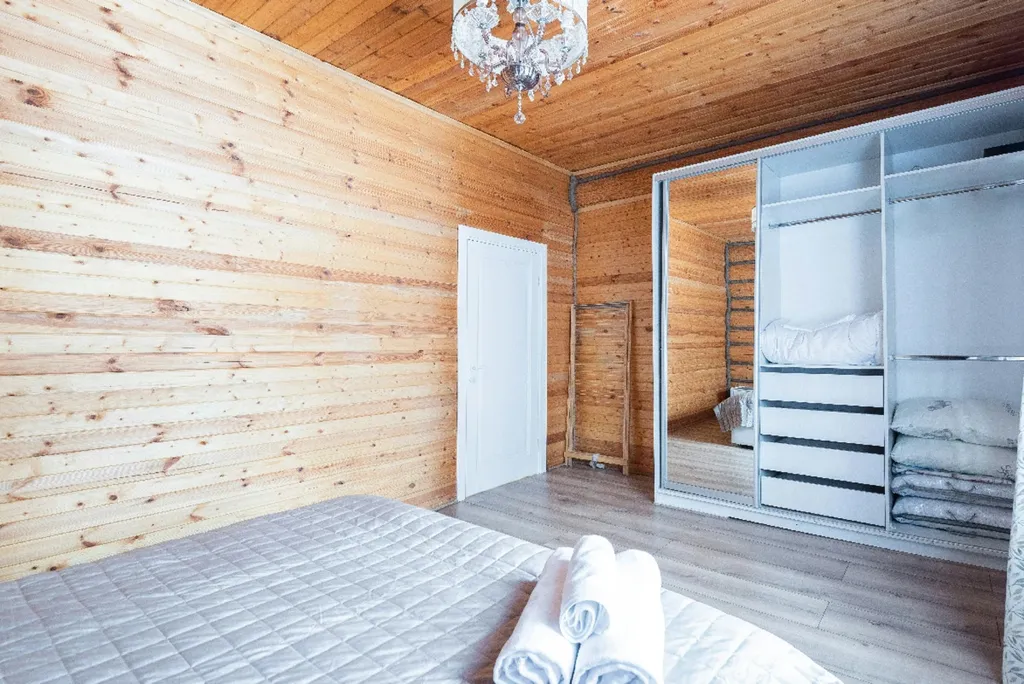 Деревянный дом из сруба с современным дизайном. 5 спальных комнат с большими двуспальными кроватями, вместительная гостиная, кухня и две душевые комнаты. Для нас очень важно, чтобы вы чувствовали себя комфортно и уютно в наших домах.