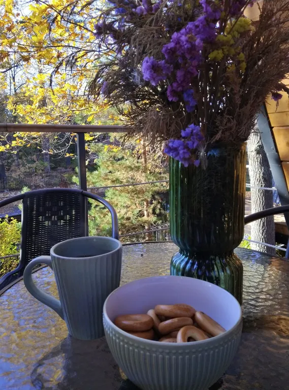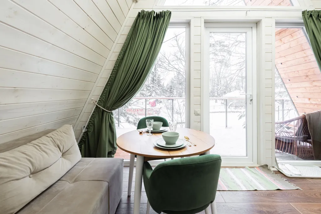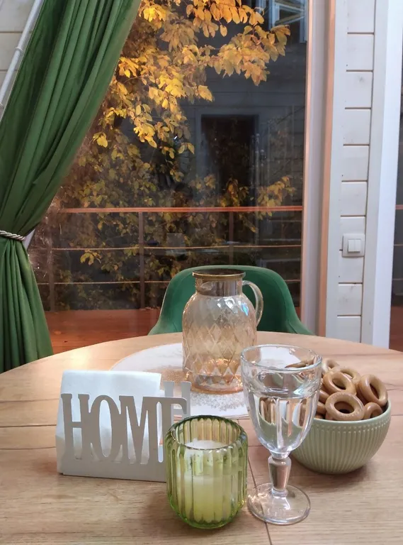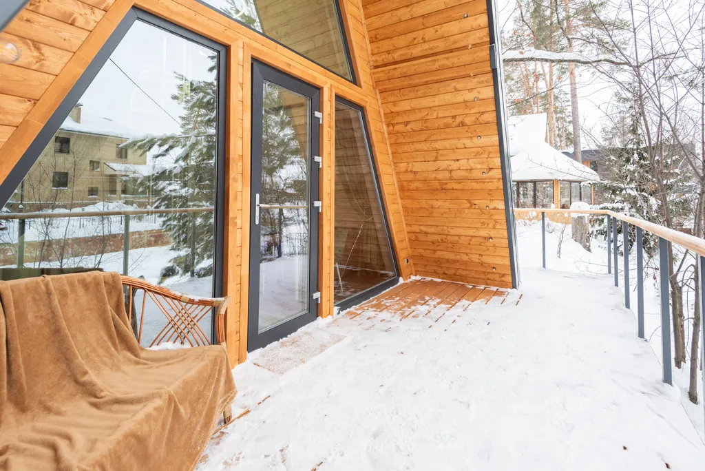 Большое панорамное окно с видом на озеро и терраса. У нас тепло и зимой, и осенью благодаря теплым полам и обогревателям. А для жарких дней установлен кондиционер.